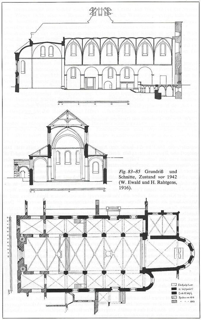 Dans les vestiges des thermes romains, l'archevêque Willibert fonda après 870 le premier couvent des Dames de Cologne, qui fut probablement détruit peu après par les Normands. Il fut refondé vers 888. D'après les résultats des fouilles, le bâtiment d'origine aurait été une salle de 9,3 mètres sur 27,2 mètres avec un choeur rectangulaire. Faute de critères permettant de la dater, une extension ou une reconstruction n'a pas été attribuée au IXe siècle et a donc été située au milieu du Xe siècle. Compte tenu des normes carolingiennes désormais connues, on peut supposer qu'après les destructions causées par les Normands, le bâtiment a été reconstruit et agrandi par une crypte occidentale, un choeur occidental avec une tribune pour les nonnes et, en raison de l'épaisseur des fondations, probablement aussi une construction occidentale surélevée. De plus, la salle existante à l'est a été dotée de pièces annexes latérales. À partir de 1100, l'édifice a été transformé en une basilique à trois nefs avec une crypte agrandie et un chevet à trois absides à l'est.