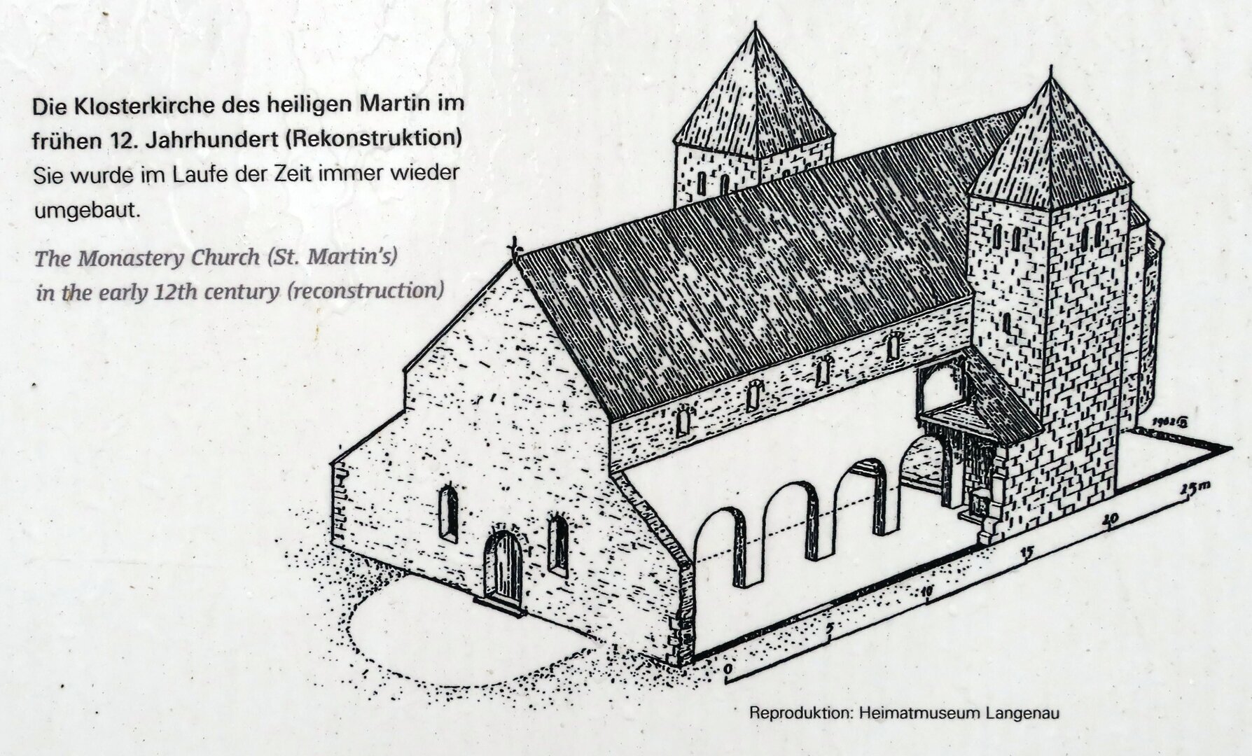 Sur les vestiges d'un temple romain du Ier siècle et au sein d'un cimetière post-romain, une famille noble alamanique fit construire vers la fin du VIIe siècle une chapelle missionnaire qui lui était réservée. Les fouilles archéologiques ont révélé que le bâtiment d'origine était une petite salle située exactement au-dessus des fondations du temple, mais qu'il fut rapidement transformé, probablement au VIIIe siècle, en une salle avec un choeur rectangulaire en retrait. Une extension à trois nefs avec des absides dans les nefs latérales a probablement été réalisée vers 1120. La construction actuelle a commencé en 1301 avec un chour, suivi au XIVe siècle d'une nouvelle nef gothique, qui a été baroquisée en 1668.