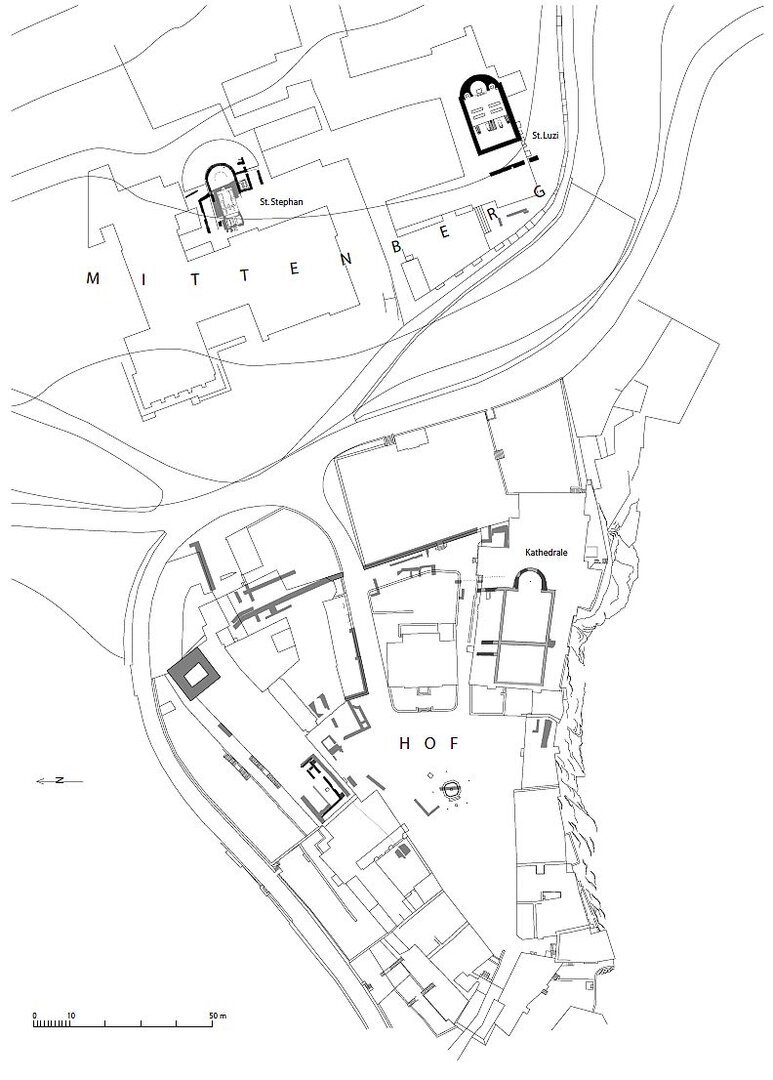 Noch vor Gründung des Bistums Curia (obj-126) um 450 entstand bereits vor 400 außerhalb der römischen Stadt eine Andreasmemorie als Saalkirche mit Apsis und Krypta. Ein Bau II entstand durch Umbauten als Grabkirche für Bischof Valentian um 540. In karolingischer Zeit wurde wohl um 730 die Grabkirche erneut umgestaltet und als Pilger- aber auch Kanonikerkirche genutzt. Es wird ein Saal mit drei Apsiden, die nach außen von einem apsidialen Mauerverband umschlossen sind. Im 12. Jahrhundert wird die Kirche den Prämonstratensern übergeben und 1295 ein Umbau geweiht. Nach diversen Zerstörungen im 15. bis 17. Jahrhundert brannte die Kirche 1811 und ein Neubau entstand über den frühmittelalterlichen Resten.