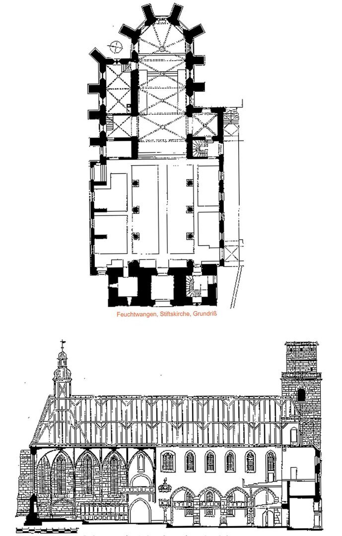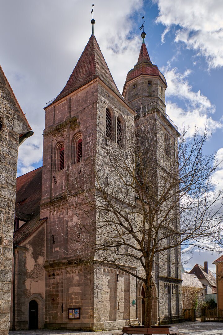 Dans une liste des impôts datant de 817 pour Louis le Pieux, Fiuhctinwanc est mentionné comme un monastère ayant déjà une certaine importance. On peut donc supposer que sa fondation est bien antérieure à 817, peut-être vers 780/814, car selon une légende, Charlemagne, qui séjourna régulièrement dans la partie orientale du pays de 780 jusqu'à sa mort, en serait le fondateur. Dès 817, Feuchtwangen était une abbaye impériale, puis au Xe siècle, elle devint le monastère privé de l'évêque d'Augsbourg. Nous n'avons aucune information sur les premiers bâtiments, mais nous pouvons supposer qu'il s'agissait d'édifices tout à fait remarquables. Les invasions hongroises ont dû durement toucher le monastère. À la fin du Xe siècle, un renouveau commença, certainement accompagné d'une nouvelle construction. On ignore l'étendue et la forme de cette construction. On peut toutefois supposer qu'au moins un petit prédécesseur du bâtiment ouest du XIIe siècle existait déjà vers 990. En 1197, une basilique à deux tours a été construite, qui est en grande partie conservée. Un chour gothique a été ajouté au début du XIVe siècle. D'autres modifications mineures ont suivi.