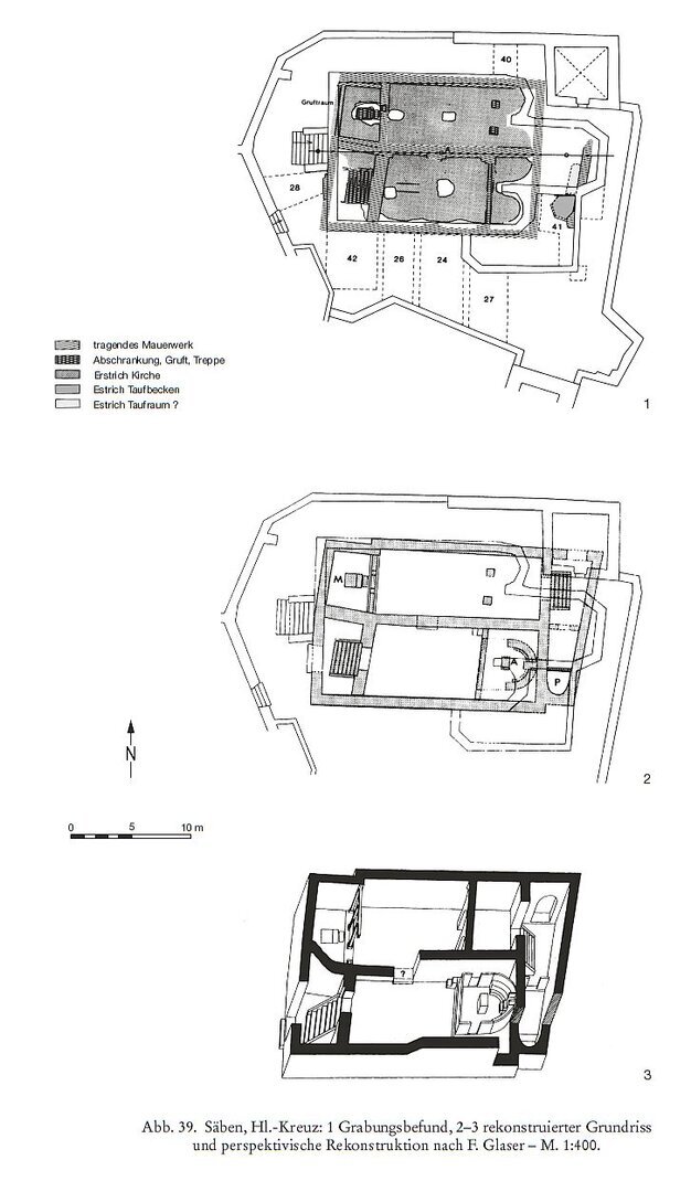 Le diocèse aurait été fondé vers 350 par Cassien à la frontière sud de la province romaine de Rhétie. Au sommet de la crête, sous l'actuelle église Sainte-Croix, une église paléochrétienne a été découverte, qui était probablement l'église épiscopale. Il s'agissait d'une église double avec deux nefs, un banc sacerdotal en abside, un baptistère situé dans une pièce séparée et un vestibule. À l'intérieur se trouvait un tombeau contenant des reliques, dont le sarcophage a été retrouvé. Il s'agit probablement d'un édifice datant des environs de l'an 400. Au VIIIe siècle, appartenant désormais au duché de Bavière et à l'archevêché de Salzbourg, elle a probablement été rénovée, mais la structure centrale est restée inchangée, seules des modifications intérieures ont été apportées. Après des transformations romanes et gothiques, le bâtiment actuel a été construit en 1679. Au sud, en contrebas du complexe épiscopal, dans la zone de la chapelle Sainte-Marie, une autre église paléochrétienne, avec une salle et une abside, datant du début du Ve siècle, a été mise au jour.