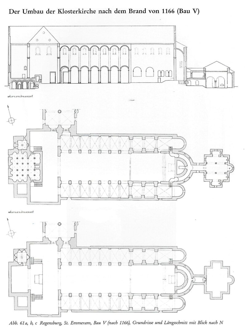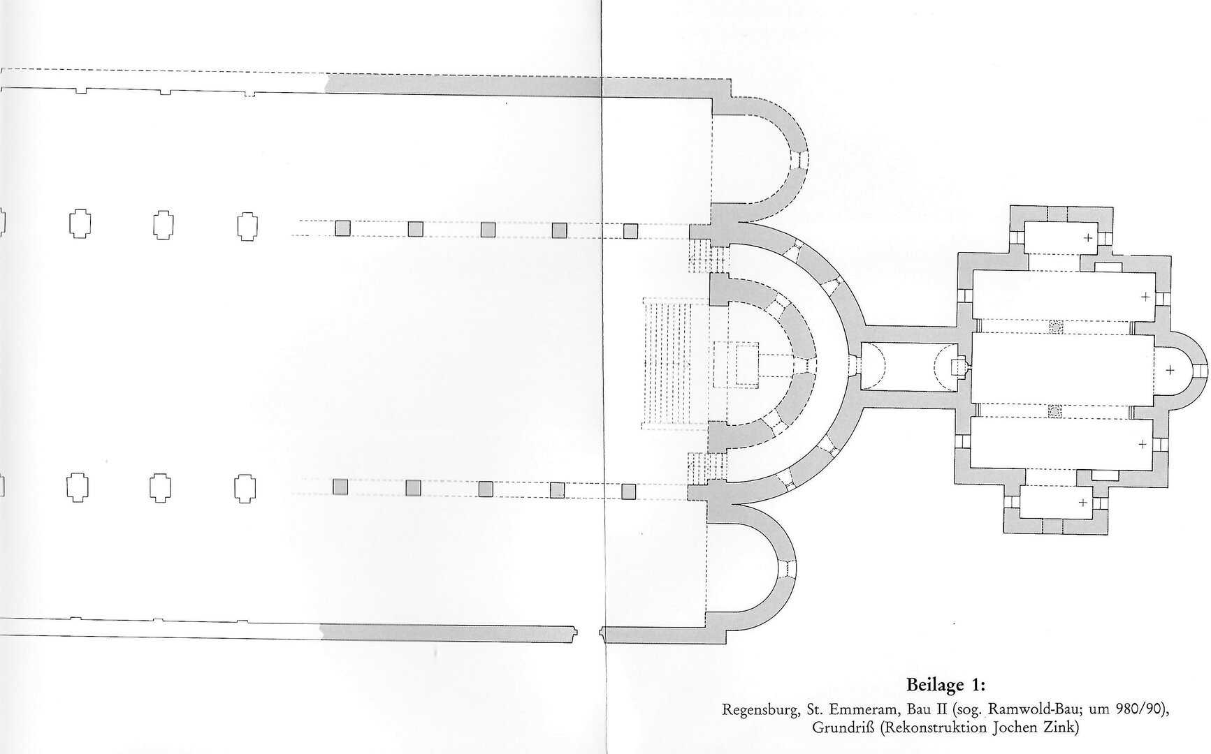 Der Wandermönch Emmeram aus Luxeuil wurde in einer Georgskapelle auf einem römisch/merowingischen Friedhof 652/692 außerhalb der Stadt beigesetzt (Grab Südapsis). Um 780 entstand unter Bischof Sintpert auf Veranlassung durch Karl über dem Grab der Neubau einer dreischiffigen Basilika mit drei Apsiden sowie einer Umgangskrypta als Benediktinerklosterkirche, die bischöfliches Eigenkloster war. Um 980 erfolgte der Anbau einer rechteckigen Außenkrypta (sog. Ramwoldkrypta). Eine Spätdatierung des gesamten Bauwerks auf um 980 ist abzulehnen. Wie der karolingische Westteil aussah, ist unklar. Über einen Westakzent aus der Zeit um 780/790 ist zu spekulieren, zumal später ein Westquerhaus mit Westkrypta entstand, vielleicht spätestens um 980. Um 1050 baute man ein Westquerhaus mit Hallenkrypta für die Reliquien von Dionysius und Wolfgang an. Nach einem Brand des Langhauses 1166 wurde dieses verändert. 1731 erfolgte eine barocke Ausgestaltung.