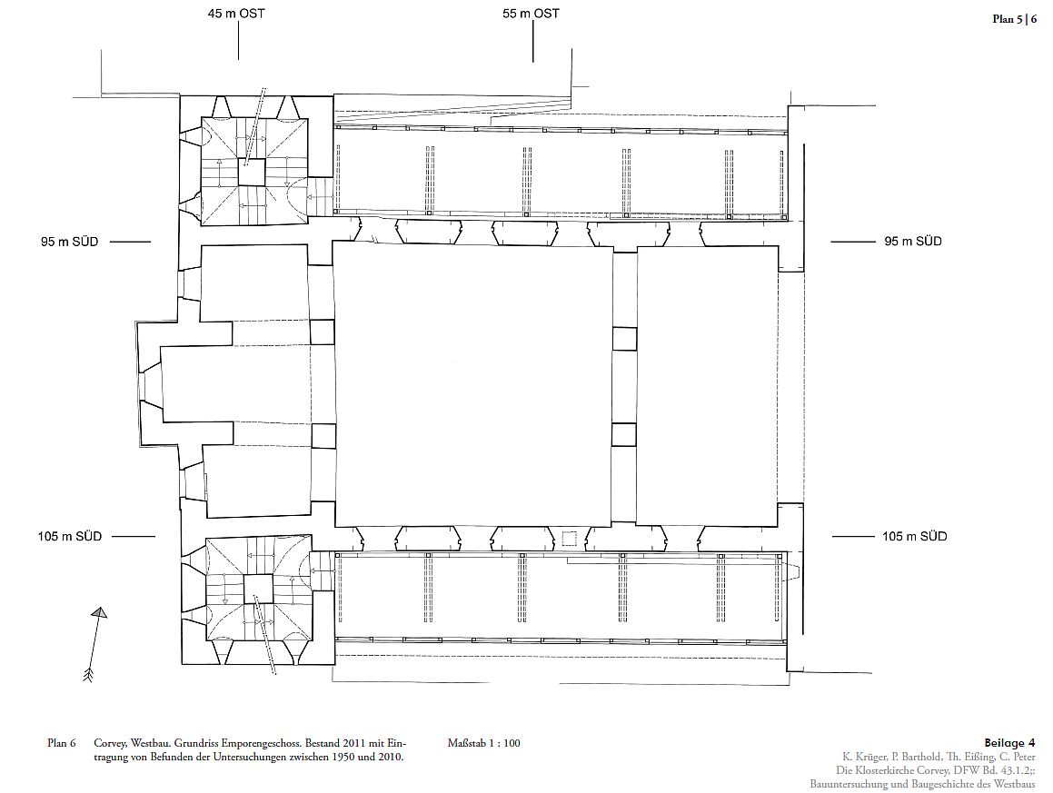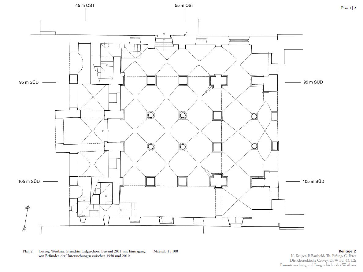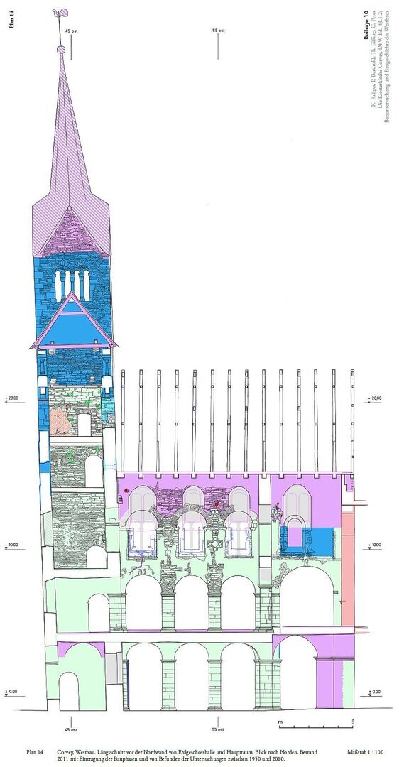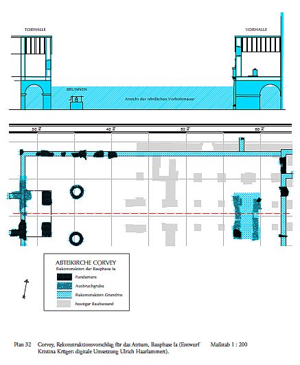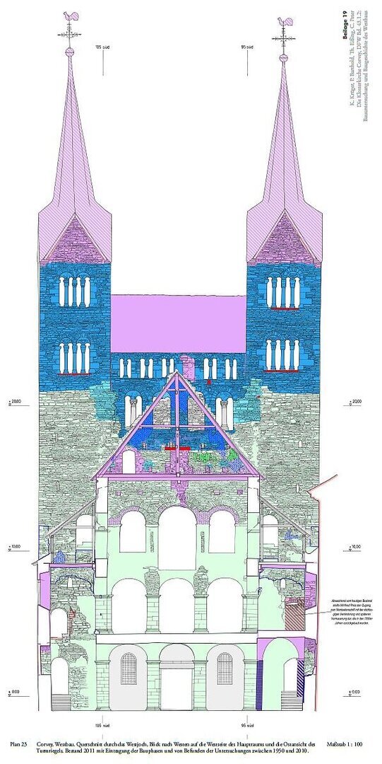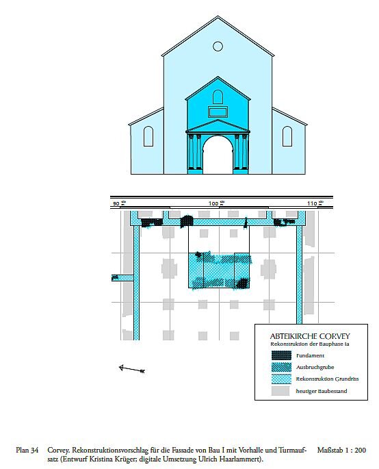 Noch auf Weisung Karls des Großen (+814) wurde 815 in dem bis heute nicht genau lokalisierten, aber unweit von Corvey gelegenen Hethis, eine Abtei als Stützpunkt während der Sachsenkriege zur Absicherung sächsischer Gebietet gegründet. Später, vor 822, wurde der Standort verlegt. Das Kloster wurde mit Mönchen aus Corbie und Verwandten der königlichen Familie besetzt. Gründungsabt war Adalhard, der als Abt von Corbie (obj-9) den dortigen Neubau geleitet hatte. Die Lage des neuen Klosters Corvey (Nova Corbeia) am Hellweg (Salzweg, wichtige O-W-Handelsstraße Brügge-Novgorod) war strategisch günstig am westlichen Weserübergang bei Höxter. Erst 822 erfolgte schließlich der Bau der Klosterkirche. Es folgte eine kulturelle Blüte des Klosters mit einer Bibliothek mit den Gesetzen Karls sowie antiken Schriften z.B. von Tacitus, Cicero. 822-844 entstand Bau I, eine dreischiffige Basilika mit einem Westbau und einem Atrium. 836 wurden Reliquien des Vitus aus Saint-Denis hierher gebracht. Bau I hatte bereits einen Westbau. Grabungen haben westlich vor der Kirche eindeutige Spuren eines Vorbaus aufgedeckt. In rund sechs Metern Abstand vor der Fassade ist ein längeres Fundamentstück in Nord-Süd-Ausrichtung gefunden worden, das zusammen mit der nördlich in gleicher Flucht verlaufenden angrenzenden Ausbruchgrube eindeutig zu einem massiven Fundament gehören muss, das somit in einer Breite von rund sechs Metern und einem Abstand von sechs Metern parallel vor der Fassade lag. Im rechten Winkel liegt noch ein Fragment eines Fundaments, das die Nordmauer markiert. Diese Teile können nur das Fundament eines schmalen, damit quadratischen Westbaus gewesen sein, der mit seiner Form typischerweise in die Zeit passt. Diese These wird nun bestätigt durch die neueste Forschung (Krüger 2025), die immerhin eine zweigeschossige Vorhalle vor Bau I vermutet. Dem Westbau vorgelagert gab es auch bereits jetzt ein Atrium mit einem Torbau. 867 erfolgte der Neubau von Chor, Querhaus sowie einer Außenkrypta. 873-885 errichtete man einen neuen größeren Westbau, der in wesentlichen Teilen original erhalten ist. Der neue Westbau gehört dem breiten Typus an, als Durchgangsraum zur Kirche im Erdgeschoss, sowie mit zweigeschossigem Obergeschoss. Unten rahmen Pfeiler den von vier Säulen gestalteten zentralen Durchgangsbereich. Oben ist die Mitte zweigeschossig mit Umgangsemporen. Die These, die westliche Empore soll der Platz für den Kaiser gewesen sein und dieser habe dort auf einem Thron gesessen, wie dies in seiner Pfalzkapelle in Aachen der Fall war, wird für Corvey bereits seit langem angezweifelt. Die offene Empore mit dem Fenster nach Westen war vielmehr der Platz, wo, überstrahlt vom Licht, die verehrten Reliquien ausgestellt wurden. Corvey lässt uns mit den Resten der Innendekoration, so Fragmente von originaler Wandmalerei mit Szenen aus der antiken Erzählung der Odysee, erahnen, wie die anderen Westbauten ausgesehen haben. Im 10. Jahrhundert (?) erfolgte eine Aufstockung der Türme. 1145-1159 wurde der Westbau mit Quergalerie umgestaltet und die Westtürme aufgestockt. Der Mittelturm wurde abgetragen. Nach Zerstörung im 30-jährigen Krieg erfolgte 1667-1671 der Neubau von Langhaus und Chor.