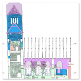 En 815, sur ordre de Charlemagne (+814), une abbaye fut fondée à Hethis, non localisée à ce jour, mais située non loin de Corvey, comme point d'appui pendant les guerres de Saxe pour protéger les territoires saxons. Plus tard, avant 822, le site a été déplacé. Le monastère fut occupé par des moines de Corbie et des parents de la famille royale. L'abbé fondateur était Adalhard qui, en tant qu'abbé de Corbie (obj-9), avait dirigé la nouvelle construction dans cette ville. La situation du nouveau monastère de Corvey (Nova Corbeia) sur le Hellweg (chemin du sel, importante route commerciale est-ouest Bruges-Novgorod) était stratégiquement favorable au passage occidental de la Weser près de Höxter. Ce n'est qu'en 822 que l'église du monastère fut finalement construite. Il s'ensuivit une floraison culturelle du monastère avec une bibliothèque contenant les lois de Charlemagne ainsi que des écrits antiques, par exemple de Tacite et de Cicéron. De 822 à 844, le bâtiment I, une basilique à trois nefs avec un bâtiment occidental et un atrium, fut construit. En 836, des reliques de saint Vite (Guy) y furent apportées de Saint-Denis. Le bâtiment I avait déjà un bâtiment occidental. Des fouilles ont révélé à l'ouest, devant l'église, les traces évidentes d'un porche. A une distance d'environ six mètres devant la façade, on a trouvé un long morceau de fondation orienté nord-sud qui, avec la fosse d'excavation adjacente s'étendant au nord dans le même alignement, doit clairement appartenir à une fondation massive, qui se trouvait donc parallèlement devant la façade sur une largeur d'environ six mètres et à une distance de six mètres. A angle droit se trouve encore un fragment de fondation marquant le mur nord. Ces parties ne peuvent avoir été que les fondations d'un bâtiment occidental étroit, donc carré, dont la forme est typique de l'époque. Cette hypothèse est désormais confirmée par les dernières recherches (Krüger 2025), qui supposent l'existence d'un porche à deux étages devant le bâtiment I. Devant le bâtiment occidental, il y avait déjà un atrium avec une porte fortifiée. En 867, le choeur, le transept et la crypte extérieure furent reconstruits. En 873-885, un nouveau bâtiment occidental plus grand fut érigé, dont les parties principales sont restées originales. Le nouveau bâtiment occidental appartient au type large, en tant qu'espace de passage vers l'église au rez-de-chaussée, et avec un étage supérieur à deux niveaux. En bas, des piliers encadrent la zone de passage centrale formée par quatre colonnes. En haut, le centre est à deux étages avec des portiques. La thèse selon laquelle la galerie ouest aurait été la place de l'empereur et que celui-ci s'y serait assis sur un trône, comme c'était le cas dans sa chapelle palatine à Aix-la-Chapelle, est depuis longtemps mise en doute pour Corvey. La galerie ouverte avec la fenêtre vers l'ouest était plutôt l'endroit où étaient exposées les reliques vénérées, éclairées par la lumière. Corvey nous laisse imaginer ce à quoi ressemblaient les autres bâtiments occidentaux grâce aux vestiges de la décoration intérieure, comme des fragments de peintures murales originales représentant des scènes de l'antique récit de l'Odyssée. Au 10e siècle ( ?), les tours ont été surélevées. En 1145-1159, le bâtiment ouest avec galerie transversale a été remanié et les tours ouest ont été surélevées. La tour centrale a été démolie. Après sa destruction pendant la guerre de Trente Ans, la nef et le choeur ont été reconstruits de 1667 à 1671.