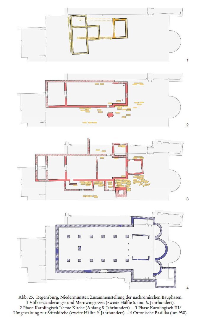 C'est à cet endroit, dans l'ancien camp légionnaire, que la première cathédrale aurait été construite vers 700/739 sur des vestiges romains. Il s'agissait d'une salle avec un chœur rectangulaire et probablement un atrium. La cathédrale fut déplacée et reconstruite plus à l'ouest vers 778 (obj-162). Au même moment, la Niedermünster dut se voir attribuer une nouvelle fonction en tant que chapitre. En 788, le duc bavarois Tassilo III fonda probablement un chapitre de dames au-dessus de l'église funéraire des évêques Erhard et Albert. Vers 788, après la destitution de Tassilo III par Charlemagne, l'église-halle existante fut progressivement agrandie par un chœur rectangulaire plus grand et probablement une construction occidentale. Un clocher indépendant fut érigé au sud de l'église. Selon une nouvelle interprétation, ces modifications n'auraient eu lieu qu'au IXe siècle, ce qui est peu probable, car la création d'un chapitre correspond à la politique franque à partir de 788. En 950, après la démolition du bâtiment précédent, un nouveau bâtiment complet à trois nefs avec un transept est et trois absides fut construit. La construction actuelle a commencé en 1146.
