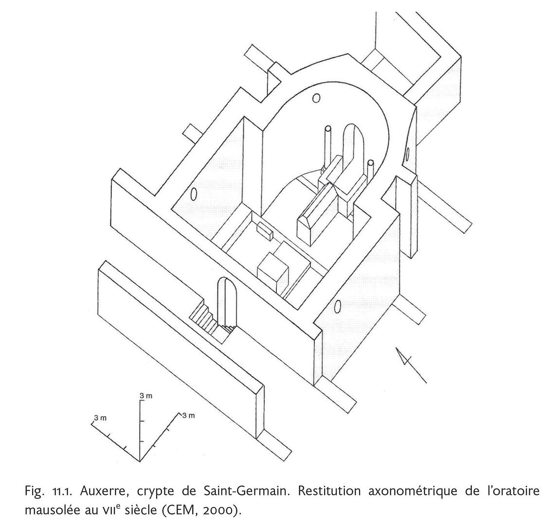Im Jahr 422 gründete Germanus (Bischof von Auxerre 418-448) eine Kirche für die Aufnahme der Reliquien des Mauritius. Über den Gründungsbau gibt es keine Informationen. Der Leichnam des Germanus wurde um 511 in einen Neubau an dieser Stelle überführt, und es erfolgte eine Klostergründung durch Chlotilde, der Gemahlin von Chlodwig, vielleicht mit dem Tod Chlodwigs (+511). Zum Kloster gehörte auch ein Baptisterium. Bereits dieser Bau oder ein Umbau des 7. Jahrhunderts besaß eine eingeschossige Krypta. Während einer Phase höchster Blüte erfolgte 841-865 ein Neubau mit zweigeschossiger Krypta im Osten und einem Westbau, der schmal und sicher hoch aufragend westlich noch vor einem dreischiffigen Narthex oder einem offenen Atrium eine Vorkirche bildete. Die Krypta ist erhalten. Die Baumaßnahme steht im Zusammenhang mit der Reliquienerhebung des Germanus im Jahr 859, bei der Karl der Kahle anwesend war. Westbau und Narthex wurden um 1023/1040 vierschiffig erneuert. 1277 begann man mit dem Chor einen gotischen Neubau, der sich bis 1398 hinzog, aber dennoch unvollendet blieb. Zerstörungen gab es bereits während der Hugenottenkriege im 16. Jahrhundert. 1811 riss man die westlichen Teile des Baues ab. 1817 schloss man den Bau 1817 mit einer neugotischen Fassade.
