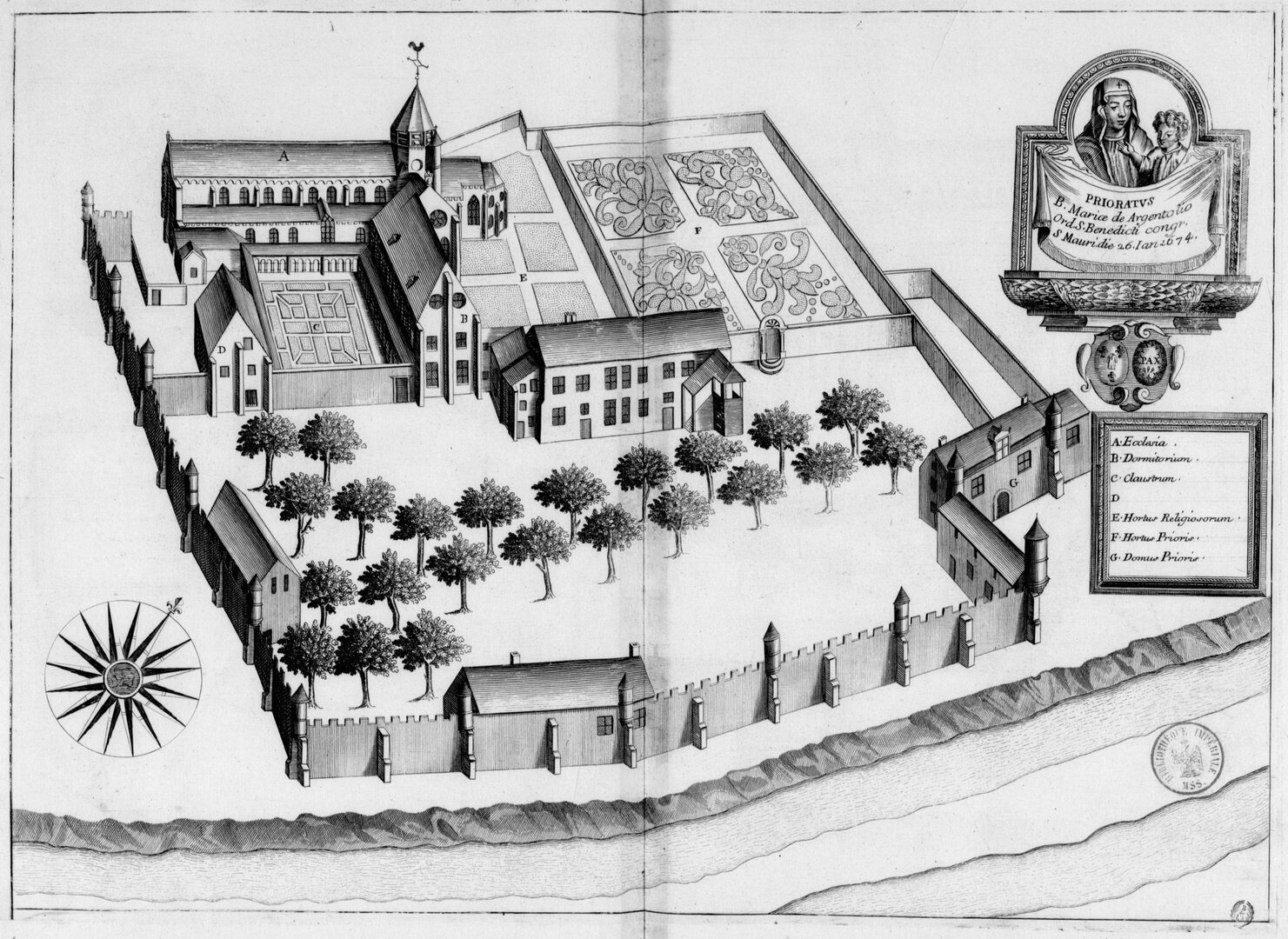 656 erfolgte die Gründung eines merowingischen Frauenklosters durch die neustrischen Adligen Ermenricus und seiner Gattin Mumana. Das Kloster wurde 697 von Childebert mit Gütern ausgestattet. Über die frühen Bauten und eventuelle karolingische Umbauten ist nichts bekannt. Der Legende nach soll Karl zur Kaiserkrönung im Jahr 800 die Tunika Jesu von der byzantinischen Kaiserin Irene erhalten haben und diese darauf dem Kloster Argentoialum geschenkt haben. Es ist zu vermuten, dass für diese Reliquie Um- oder Neubauten erfolgt sind. Zudem ist bekannt, dass das Kloster im 9. Jahrhundert eine große Bedeutung und enorme Ausdehnung besaß. Um 1150 gab es einen Neubau anlässlich der verstärkten Verehrung der Tunika. 1790 wurde das Kloster zerstört und als Steinbruch benutzt, 1916 überbaut. Ab 1989 ist es als archäologischer Park freigelegt worden. Am Rande des Abteigeländes existiert noch die Chapelle Saint-Jean-Baptiste aus dem 12. Jahrhundert, die einem Torbau ähnlich ist.