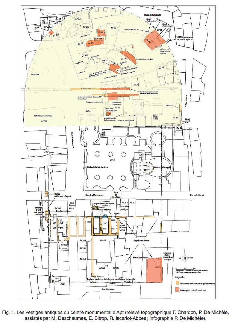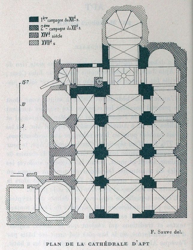 La ville romaine d'Apta Julia était située sur la route de Marseille. En dehors des murs de la ville, le premier site chrétien a été construit. Cette terra sancturia a été le premier siège épiscopal du IIIe siècle en tant que groupe de cathédrales avec la cathédrale Sainte-Anne, l'église cathédrale-cloître de Saint-Paul (obj-738) et un baptistère (obj-739). Entre 260 et 280, ce complexe a été détruit. Il a été déplacé dans la ville, où une nouvelle cathédrale a été construite sur les restes d'un temple romain, sous la forme d'un bâtiment de 10 x 16 m. Ce bâtiment était situé entre le théâtre romain et le forum. Vers 396, le siège de la cathédrale a été renouvelé sur le site actuel, probablement à l'occasion du Synode de Nîmes en 396. De cette cathédrale romaine tardive/mérovingienne précoce, il reste des parties de la petite crypte inférieure avec des rails d'autel réutilisés en torchis et en bardeaux. Des vestiges de murailles romaines ont été trouvés dans l'allée sud. Après une destruction par les Sarrasins en 896, une nouvelle construction a dû avoir lieu. La nef et l'allée sud du bâtiment actuel datent du 11ème siècle, le choeur du 14ème siècle.