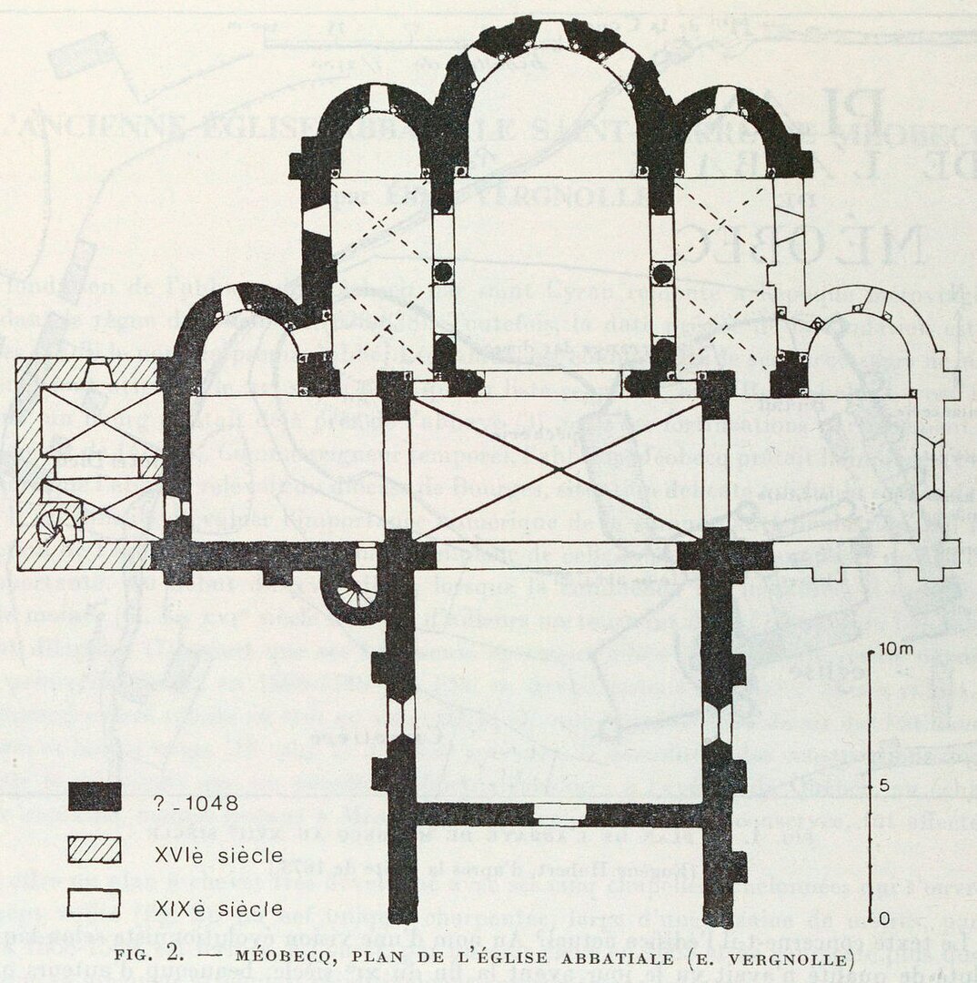 Um 630/640 wurde das Kloster von Sigirannus (Cyran), Sohn des Grafen und Erzbischofs von Tours gegründet. Sigirannus hielt sich zunächst am Hof Chlothars II. auf. Unter dessen Nachfolger Dagobert und mit dessen Unterstützung gründete er das Kloster Longoretum in Saint-Michel-en-Brenne (obj-642) und das Kloster in Méobecq. Über die frühen Bauten sind wir nicht informiert. Ein karolingischer Neubau ist zu vermuten. Der heutige Bau entstand um 1048 mit drei Apsiden. Die bemerkenswerte Bauskulptur ist mit anderen Bauten der Zeit in der Region vergleichbar. 1568 zerstörte ein Brand das Langhaus.