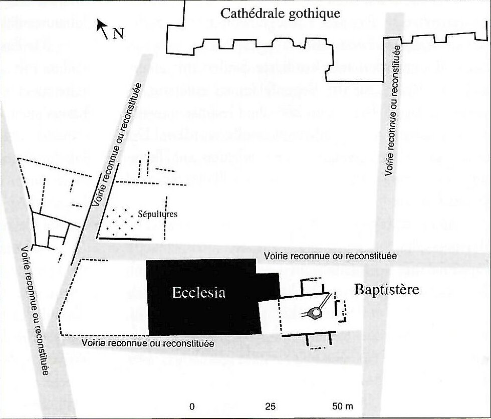 Um 340 wurde das Bistum gegründet. Der Gründungsbau lag weiter südlich und unterhalb, unmittelbar am spätantiken Baptisterium (obj-586). Die Gestalt dieses Baus ist unbekannt, es dürfte wohl eine Saalkirche gewesen sein. Zusammen mit dem Baptisterium sowie dem von der merowingischen Königin Radegundis gegründeten Kloster Sainte-Croix (obj-585) bestand ab der Mitte des 6. Jahrhunderts eine Kirchengruppe. Von der Kathedrale ist ein karolingischer Neubau von 839 überliefert, spätestens jetzt an neuem Standort, nördlich vom Baptisterium. Dieser Dom wurde nach einem Brand 1024 erneuert. Über die Gestalt des karolingischen Bauwerks gibt es auch keine Erkenntnisse. Der heutige Bau ist eine unter angevinischen Einfluss ab 1160 entstandene Hallenkirche.