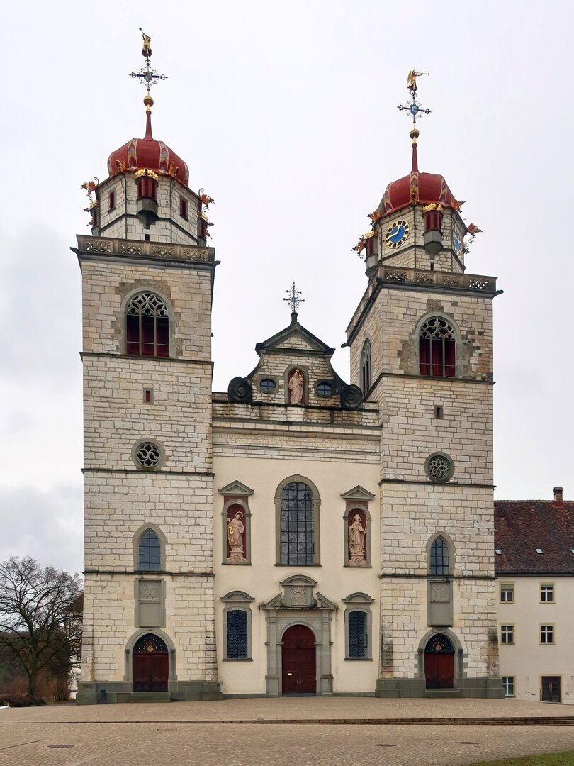 Le monastère Monasterium Rinauva a été fondé en 778 sur une île du Rhin avec le soutien de la maison royale mérovingienne. L'édifice de fondation était une salle avec un vestibule et trois absides qui, en tant qu'absides-blocs, étaient juste fermées à l'extérieur. Le moine irlandais Findan (Fintan), qui travaillait ici au début du 9e siècle, fut enterré à sa mort en 878 dans un bâtiment funéraire situé au nord de l'église. Cette construction fut précédée d'un large avant-corps, peut-être un bâtiment occidental, peut-être lors de l'élévation au rang de monastère impérial en 858. L'église romane, consacrée en 1114, était une nouvelle construction à trois nefs décalées par rapport à l'ancien axe, avec trois absides s'étendant vers l'est, une par nef. A l'ouest se trouvait une église antérieure, probablement à deux étages. L'édifice actuel a été construit en 1710, à l'apogée de sa splendeur, en tant que nouvelle construction baroque complète décalée vers le nord.