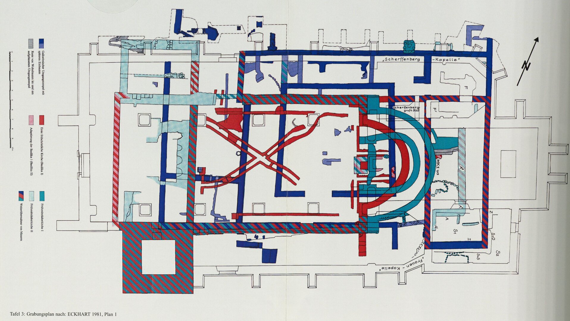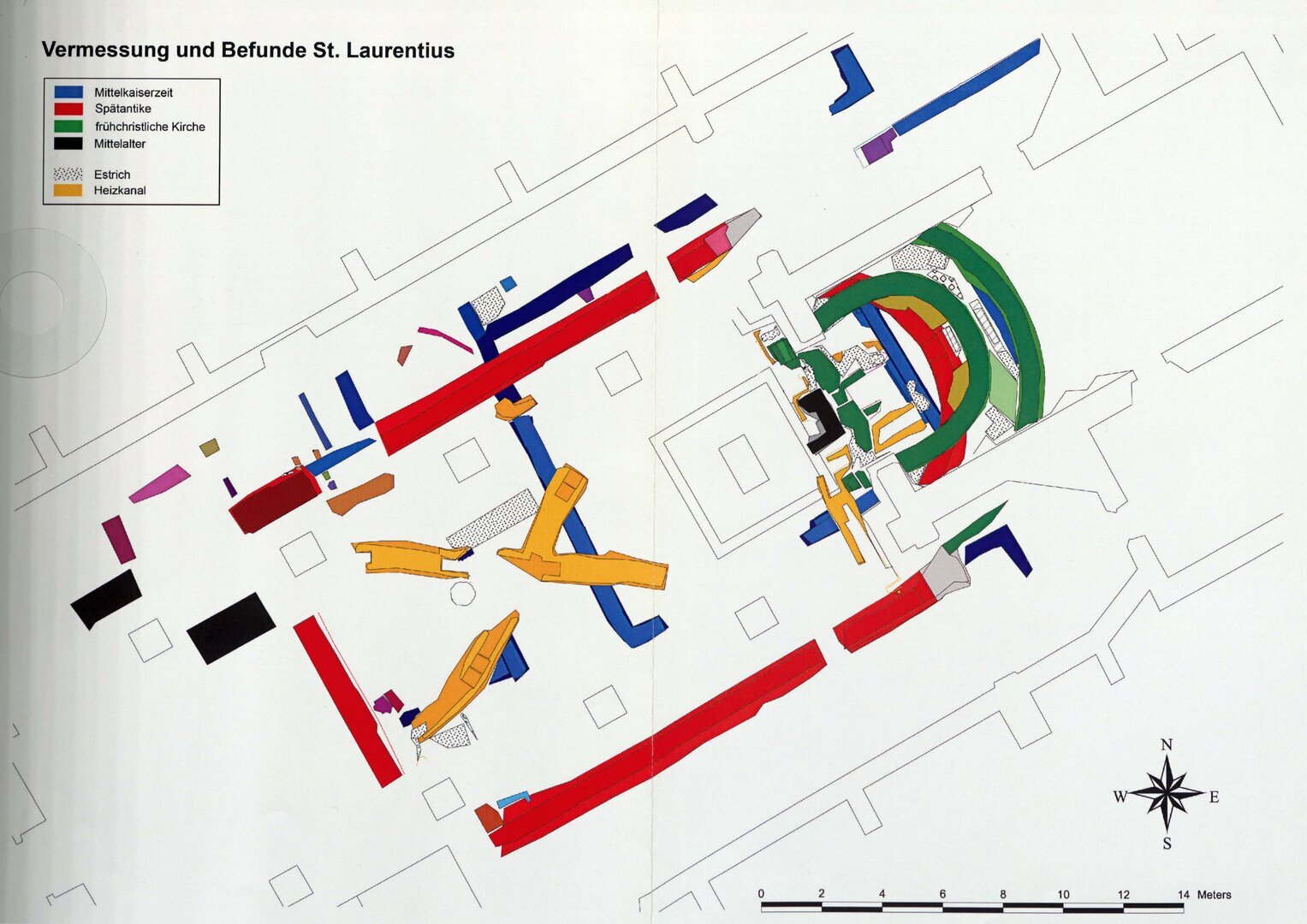 En 304, Florianus de Lauriacum y fut martyrisé. Son corps fut transporté à Saint-Florian (obj-646) où il fut vénéré à partir de 739 et servit de base à la fondation d'un monastère par Charlemagne en 791. Ses compagnons furent quant à eux inhumés à Lauriacum. C'est ici qu'un évêché fut créé à l'époque romaine, probablement avant 480, dont le premier évêque fut Constantius de Lauriacum. L'église épiscopale fut construite dans un bâtiment profane romain chauffable du IIIe siècle, qui fut transformé en salle à abside au début du IVe siècle. La construction fondatrice de l'église épiscopale a partiellement utilisé ce bâtiment vers 480. Elle a été dotée d'une nouvelle abside, qui a été équipée peu après d'un banc pour les prêtres. Malgré les fouilles, nous ne disposons d'aucune information sur les constructions de l'époque carolingienne. L'église construite en 971 possédait un bâtiment occidental qui pourrait avoir appartenu à un prédécesseur. Vers 971/991 (sous l'évêque Pilgrim de Passau), une crypte extérieure et une aile ouest ont été construites. Le bâtiment actuel est le résultat de transformations effectuées à partir de 1323. Une deuxième église chrétienne existait encore à l'emplacement de l'église Maria auf dem Anger, aujourd'hui disparue.