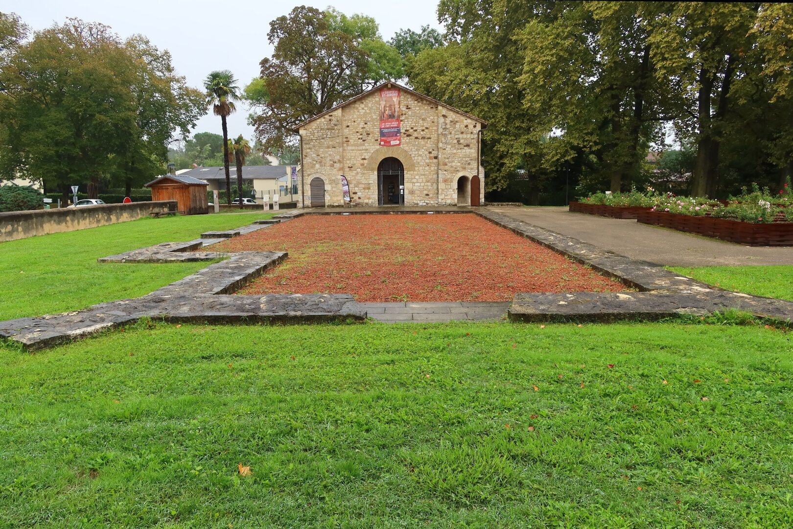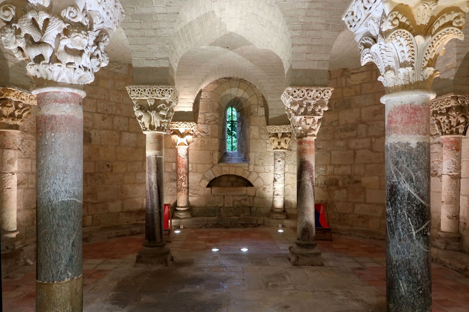 Lors de sa campagne d'Espagne en 778, Charles y fonda un monastère sur la tombe de Gerontius, où se trouvait déjà un oratoire. On ne sait rien des premières constructions, bien qu'en raison de l'élévation des reliques, une crypte et peut-être aussi déjà un bâtiment occidental soient possibles. En 859, une attaque normande a eu lieu, ce qui a peut-être conduit à une nouvelle construction partielle avec un bâtiment occidental. Au 12e siècle, une nouvelle construction probablement importante a été réalisée, dont la crypte à trois nefs, dotée de magnifiques chapiteaux, a été conservée. La nef et un bâtiment occidental sont attestés par l'archéologie, mais on ne sait pas si le bâtiment occidental roman suit un bâtiment carolingien. En 1569, il y eut un incendie. La dernière construction située au-dessus de la crypte a été démolie en 1904. Au-dessus de la crypte, une partie du choeur et de la nef est conservée.