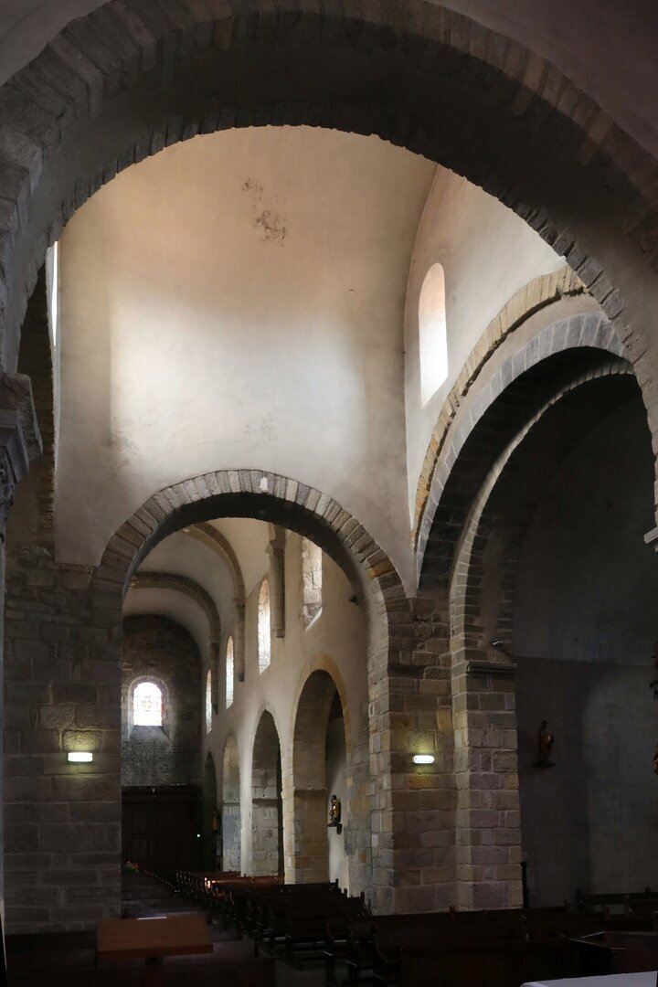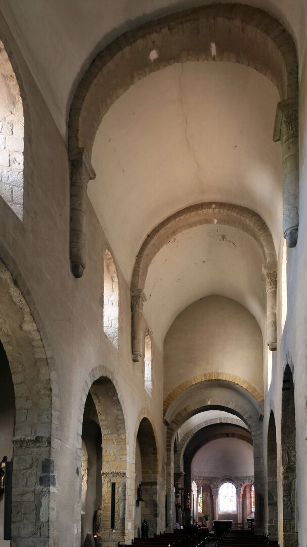 Le monastère de nonnes a été fondé vers 670. Nous ne sommes pas informés sur les premières constructions et les éventuelles transformations carolingiennes. Comme il existe des spoliations mérovingiennes et carolingiennes (chapiteaux), on peut supposer que des transformations ont eu lieu aux 7e et 8e siècles. Entre 1060 et 1090, l'édifice actuel a été construit, un bâtiment à trois nefs avec transept avec absides et tour de croisée. Des modifications ont eu lieu aux 16e et 17e siècles.